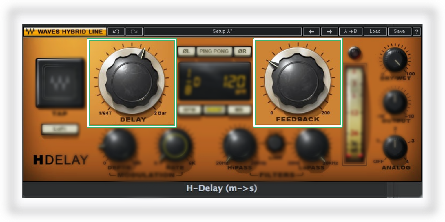 Los dispositivos de Delay digitales, a diferencia de los analógicos, suenan “demasiado” perfectos. (Ver más adelante).- Algunos aparatos dispone de un control que permite añadirle una pequeña distorsión o saturación a la cola de eco con la finalidad de que suene menos artificial.