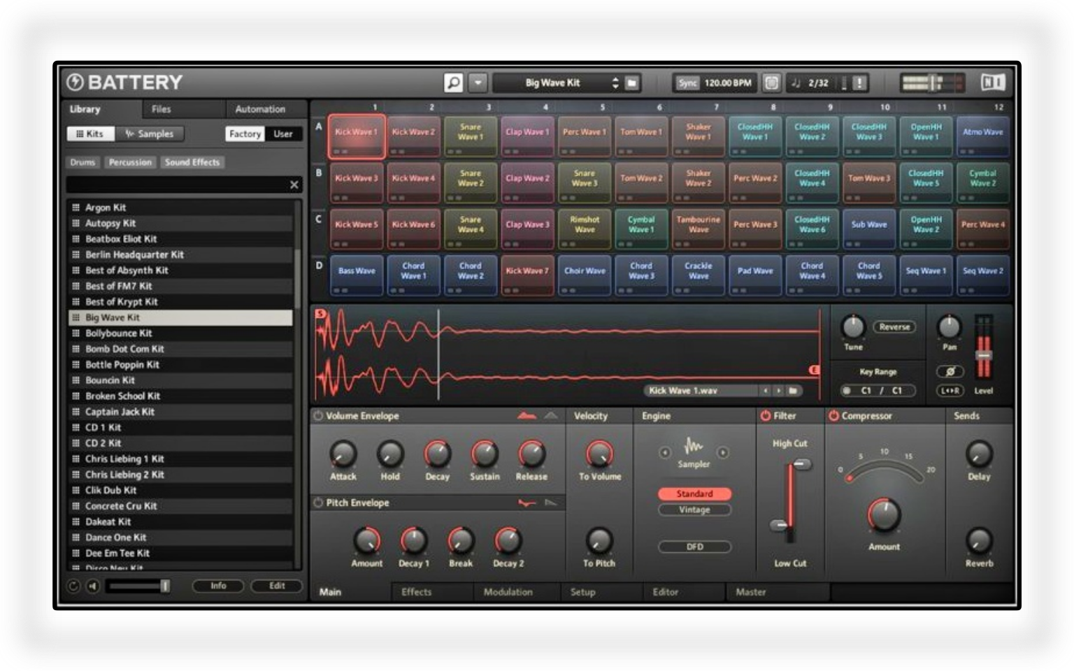 Battery, de Native Instruments [https://www.native-instruments.com/es/], es todo un referente en el software de batería y percusión.