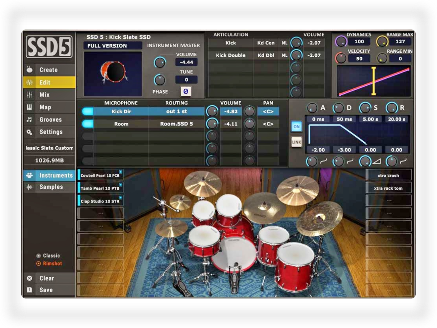 - Elementos: 46 cajas con dos cajas Deluxe de gran detalle con micrófonos de ambiente (overheads) ajustables y 12 variaciones por cada velocidad. 33 bombos, incluidos dos bombos Deluxe. 8 conjuntos de timbales.
