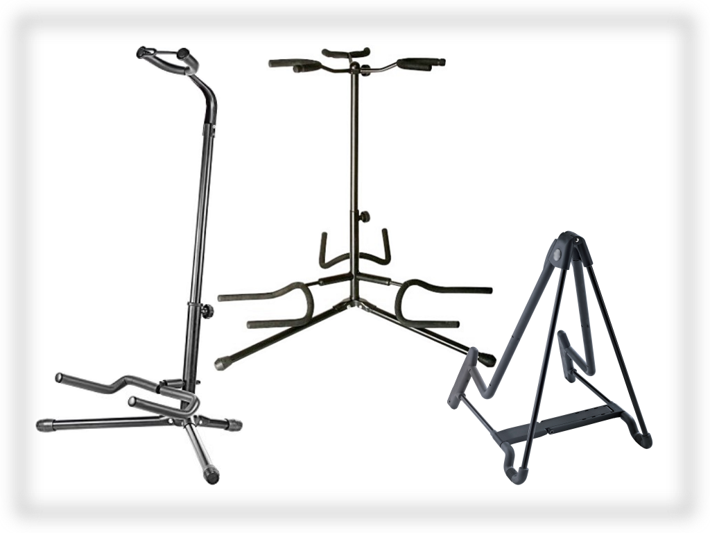 El mejor modo de apoyar las guitarras y bajos sin que se caigan o nos molesten es utilizar un soporte como alguno de los que se muestran.