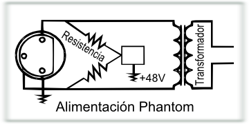 - La señal del micrófono y la alimentación Phantom comparten los mismos hilos, reservando la malla de blindaje para el retorno. Requiere, por tanto, una conexión balanceada de tipo XLR o similar