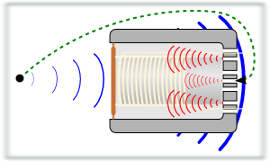 - La presión sonora que le llega por la parte posterior incide sobre el diafragma con un ligero retardo o desfase controlado respecto a la anterior, que es la que recibe la incidencia directa de la onda sonora (patrón polar cardioide).