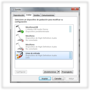Establecer el predeterminado: [BsClic] sobre el icono del micrófono USB (o el estándar, según el que hayamos conectado) y lo establecemos como predeterminado. Aplicar.