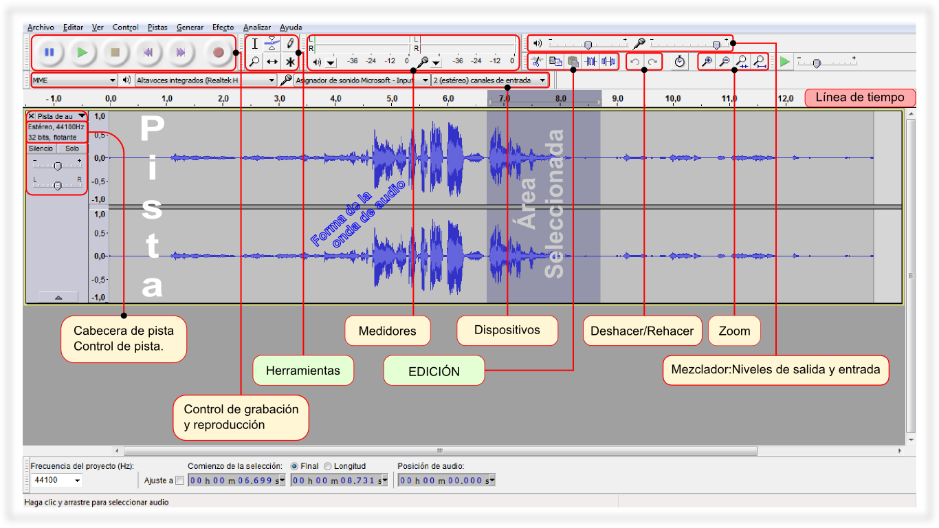 Descripción general de la ventana principal del Audacity