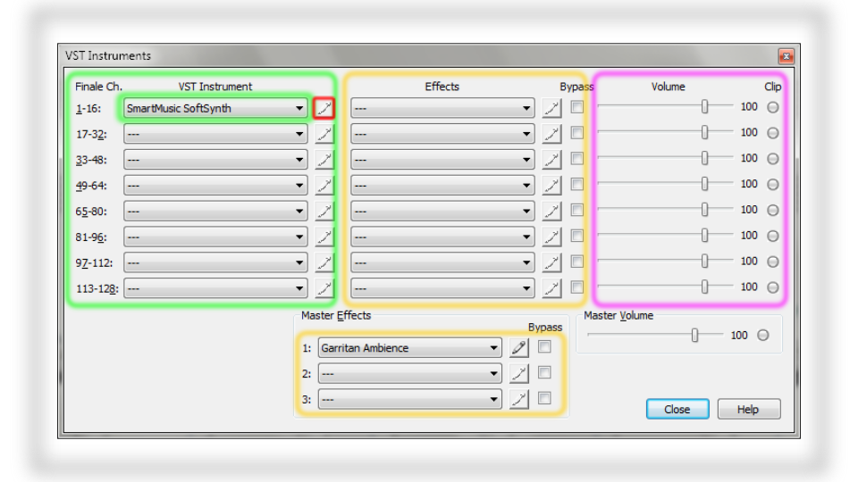Instrumentos VST (recuadro verde). Dispone de ocho ranuras o slots para cargar hasta ocho instrumentos diferentes, cada uno con sus 16 canales MIDI. Finale les asigna una numeración alternativa de canales (Finale Ch.) para diferenciarlos (No son 128 canales MIDI, sino 16 canales 8 veces). A su derecha un botón de edición (señalado en rojo) que abre la interfaz del instrumento virtual.