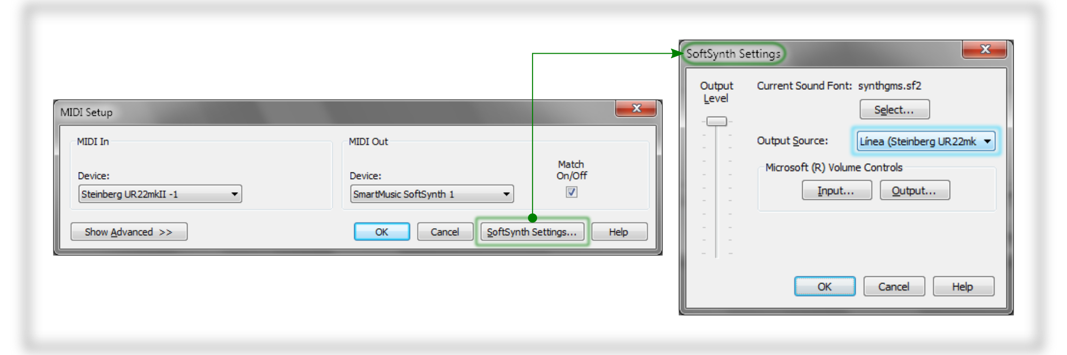 Si elegimos un dispositivo virtual, como SmartMusic SoftSynth 1 (ver imagen de arriba), tenemos que configurar, además, la salida SoftSynth: