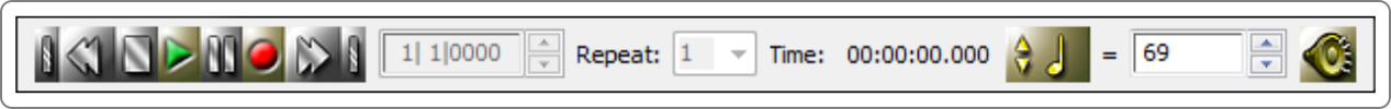 Notas: Podemos variar directamente la velocidad de reproducción (el tempo) subiendo o bajando el valor que se indica (“69”, en la imagen), siempre y cuando no hayamos definido marcas de tempo (ver), en cuyo caso se respetarán éstas (salvo que indiquemos lo contrario en las opciones de configuración del reproductor).