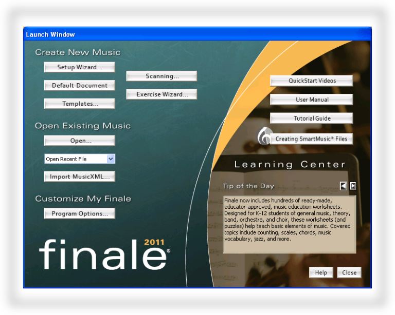 El Launch Window —Ventana de “lanzamiento”— se inicia al abrir Finale, salvo que lo hayamos configurado de otro modo en las opciones de configuración del programa.