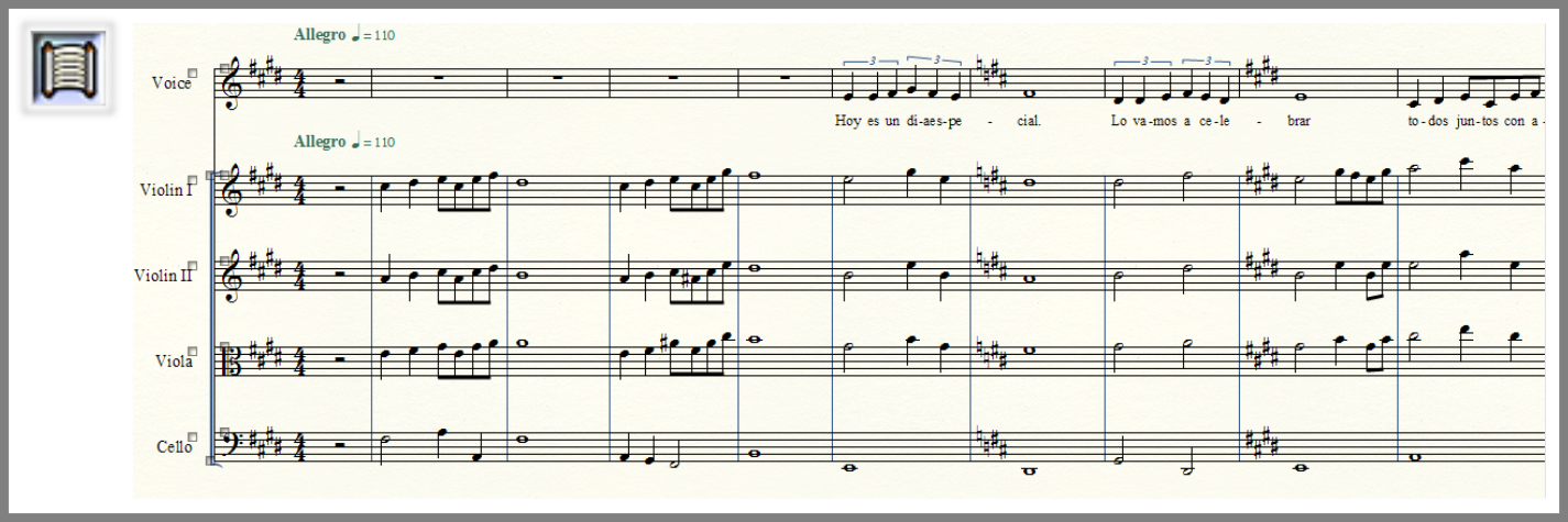 Modo de visualización muy útil cuando la partitura contiene Instrumentos transpositados (ver). Así, se presentan sus pentagramas en la tonalidad de la partitura, sin transpositar, aunque seguirán sonando como deben hacerlo. Si lo desactivamos, veremos el pentagrama en la tonalidad propia del instrumento transpositado.