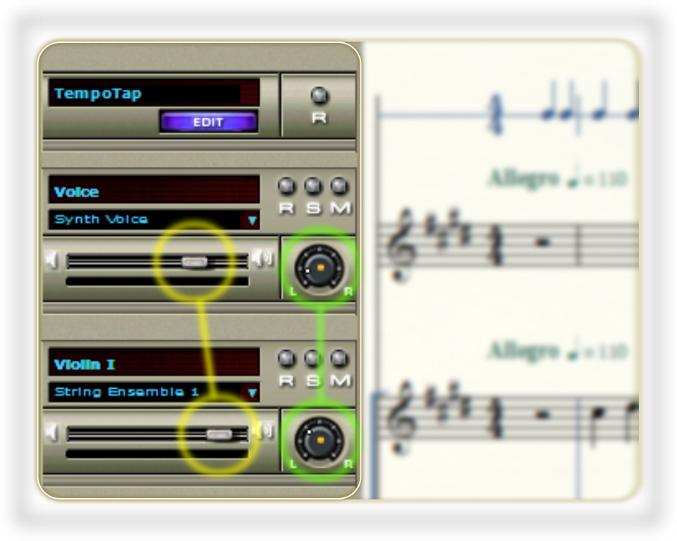 Es un panel de control sencillo que permite establecer, para cada pentagrama, el volumen (velocidad MIDI), el balance o panorama y activar las opciones de Solo y Mute. Además, incluye un botón “R”, de Record —Grabar—, para grabar pistas de audio.