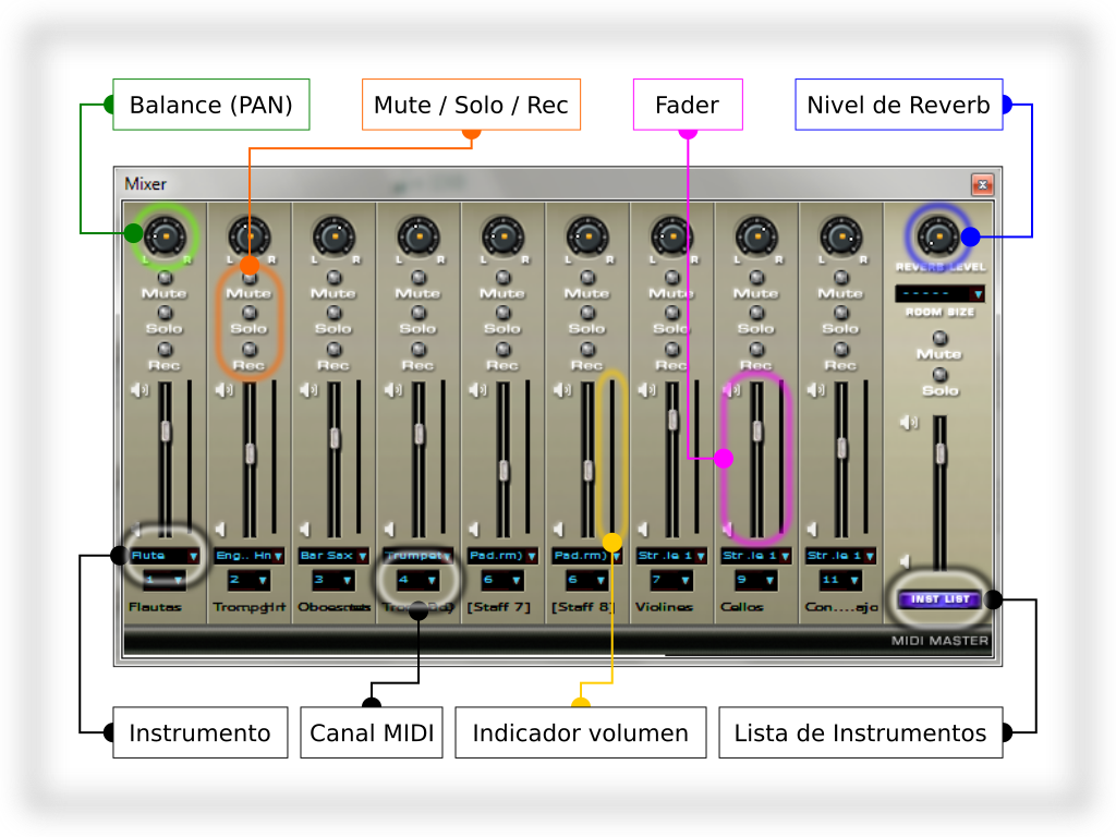 Este panel está estrechamente relacionado con el Mixer —Mezclador—, que se describe más adelante, y con la ventana de Lista de Instrumentos (ver): Los cambios que realicemos en los controles de este panel se verán reflejados automáticamente en todos las demás herramientas relacionadas y viceversa.