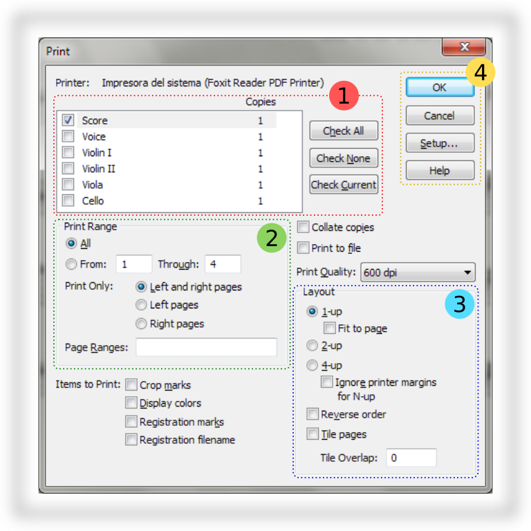 Qué queremos imprimir: Marcamos la casilla Score —Partitura— o cualquiera de las partes por separado (marcamos las casillas que deseemos).- Páginas que queremos imprimir: All —Todas—, un rango (marcamos From —Desde— y Through —Hasta—) y cuales: Izquierdas y derechas, sólo las izquierdas o sólo las derechas.